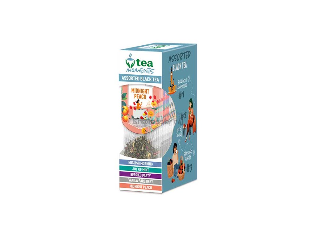 ENGLISH MORNING (směs černého čaje), JOY OF MINT (jablko 37,0 %, šípek 10,0 %, květy ibišku 23,0 %, máta 23,0 %, listy ostružiníku 5,0 %, okvětní lístky růže 2,0 %), BERRIES PARTY (černý čaj, květy ibišku 3,0 %, jahoda 0,5 %, malina 0,5 %, okvětní lístky chrpy 0,3 %, borůvka 0,5 %, černý rybíz 1,0 % s příchutí lesních plodů a jahody), VANILLA EARL GREY (černý čaj, okvětní lístky chrpy 0,5 % a příchuť bergamotu a vanilky), MIDNIGHT PEACH (černý čaj, okvětní lístky měsíčku 1,0 %, broskev 1,0 %, okvětní lístky růže 0,5 % a příchutěmi: „Exotika“ a „Broskev-Marakuja“).