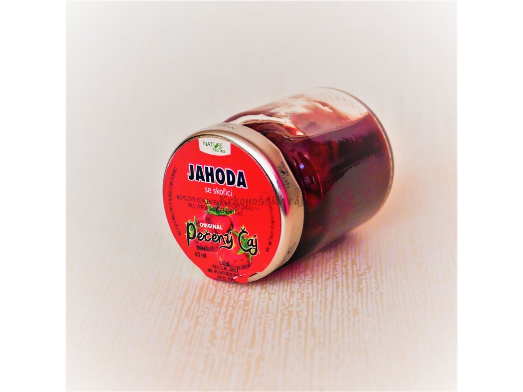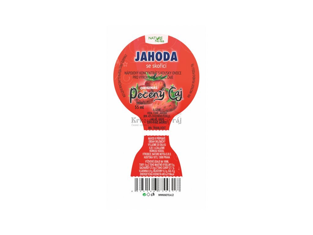 Nápojový koncentrát s kousky ovoce pro výrobu ovocného pečeného čaje s příchutí jahod a skořice. Čaj je vyráběn podle starých poctivých receptur bez přídavku chemických látek. Jahodové potěšení s příchutí skořice ve skleničce ocení zejména naše nejmenší ratolesti je sladký, voňavý a celkově velice chutný. Výrobce zaručuje minimální obsah ovoce v jedné dávce 15 g.