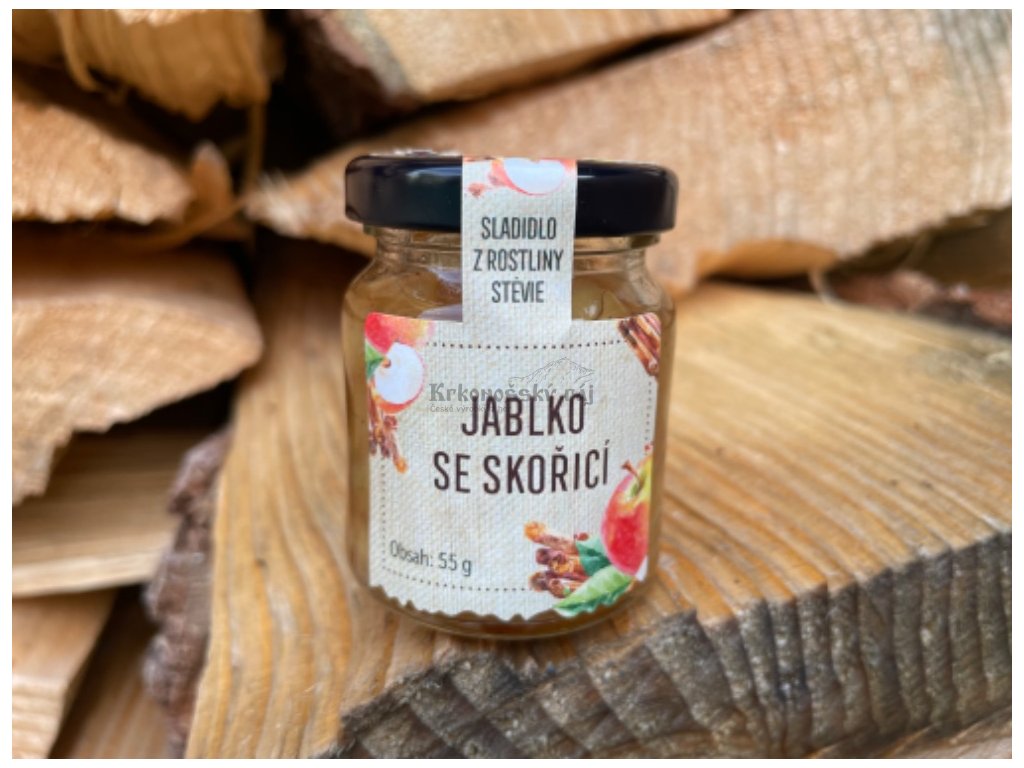 jablko 55%. jablečný koncentrát 20%, citrónový koncentrát, pitná voda, cukr, kyselina citrónová, zahušťovadlo, skořice mletá, sorban draselný, antioxidant, steviol