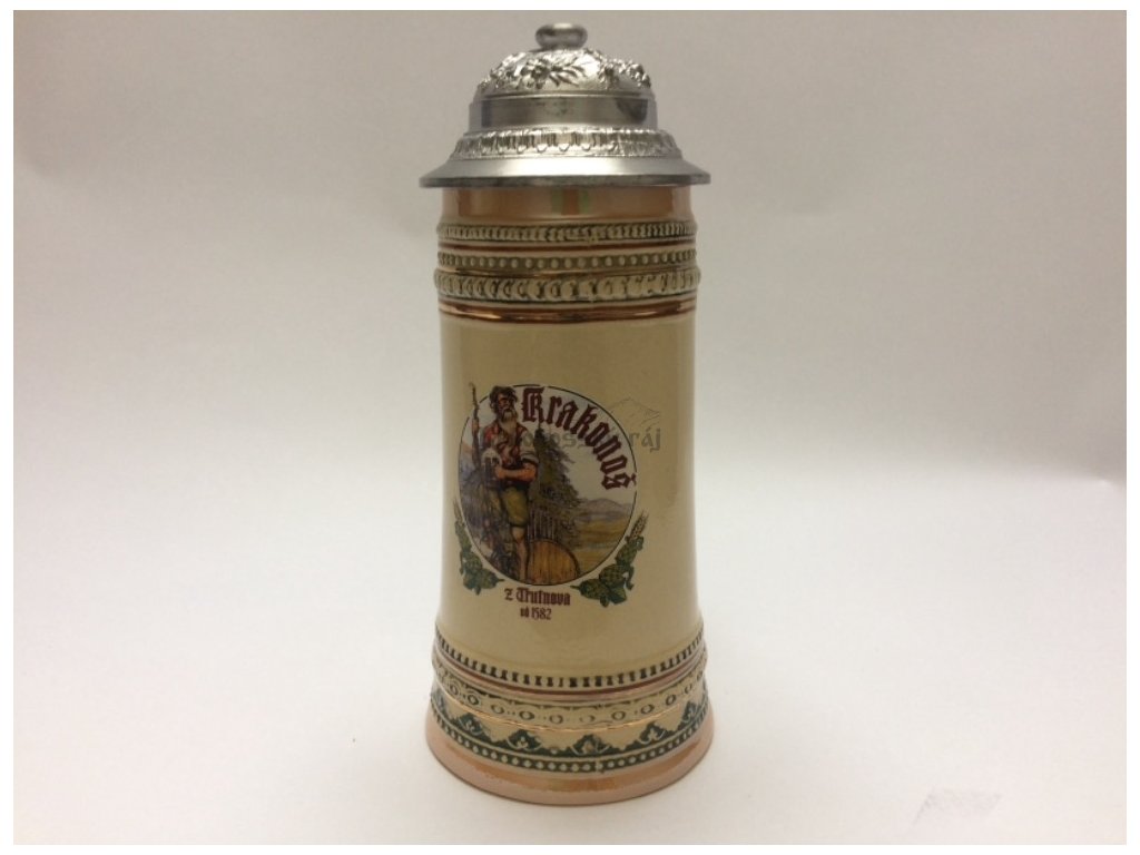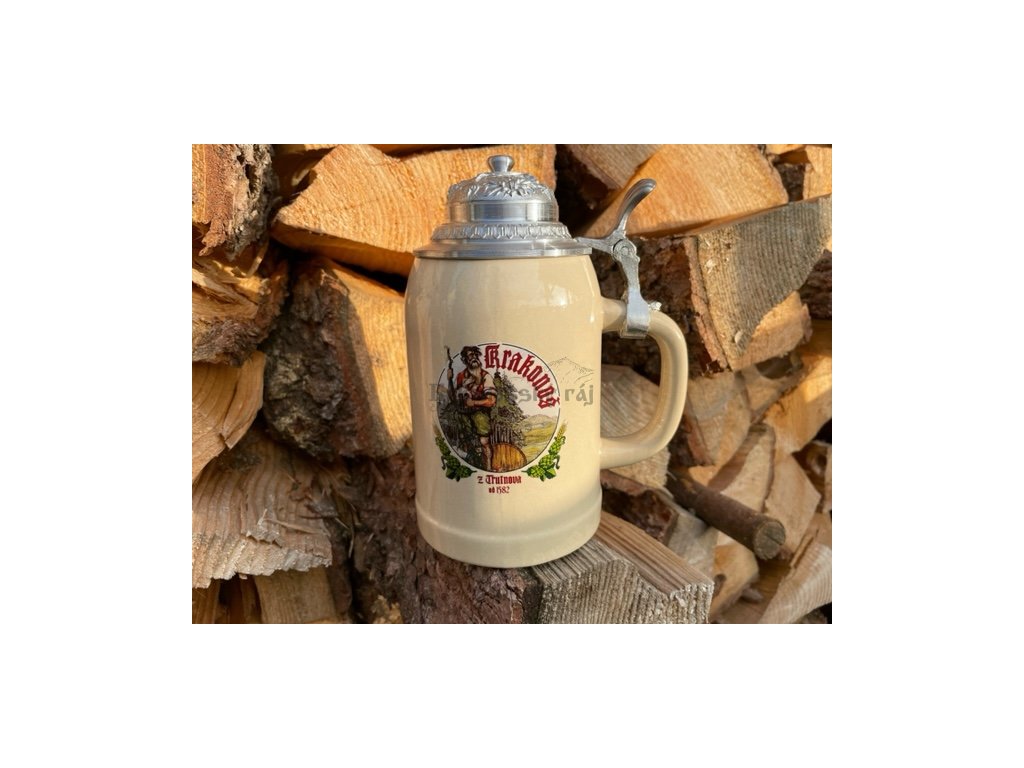 Porcelánový korbel Krakonoš na pivo s cínovým víčkem, který je bohatě zdobený, logo trutnovské pivovaru v čele s Krakonošem. Korbel je vhodný pro sběratelské účely, kdy jeho hodnota časem poroste, nebo jako skvělý dárek pro pivní fandy.